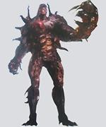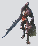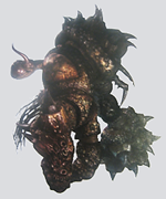 ![]() | 全身の大半を厚い外殻で覆った大型クリーチャー。 外殻はフルチャージショット以外ダメージが貫通しないため、殻のない白い部分(頭、脇、手)を狙う必要がある。 距離によって攻撃が異なり、離れている時は突進、近い時は叩きつけ攻撃をしてくる。叩きつけはまともに当たると即死なので注意。 距離を取り、突進を回避した後に離れながら露出した部分を攻撃すると良い。 叩きつけの前に手を高く上げるので手のひらを攻撃して中断させよう。 一定ダメージを与えるか、叩きつけの際に腕を攻撃するとその場に崩れてダウンする。 詳しくはキャンペーンのEp6-2を参照。 基本的に電撃グレネードヘの耐性が低いので見かけたら誘爆しないよう2個ずつ投げるのが良い。 名前はダンテ「神曲」に登場する12人の悪魔の一人に由来する。 | |||